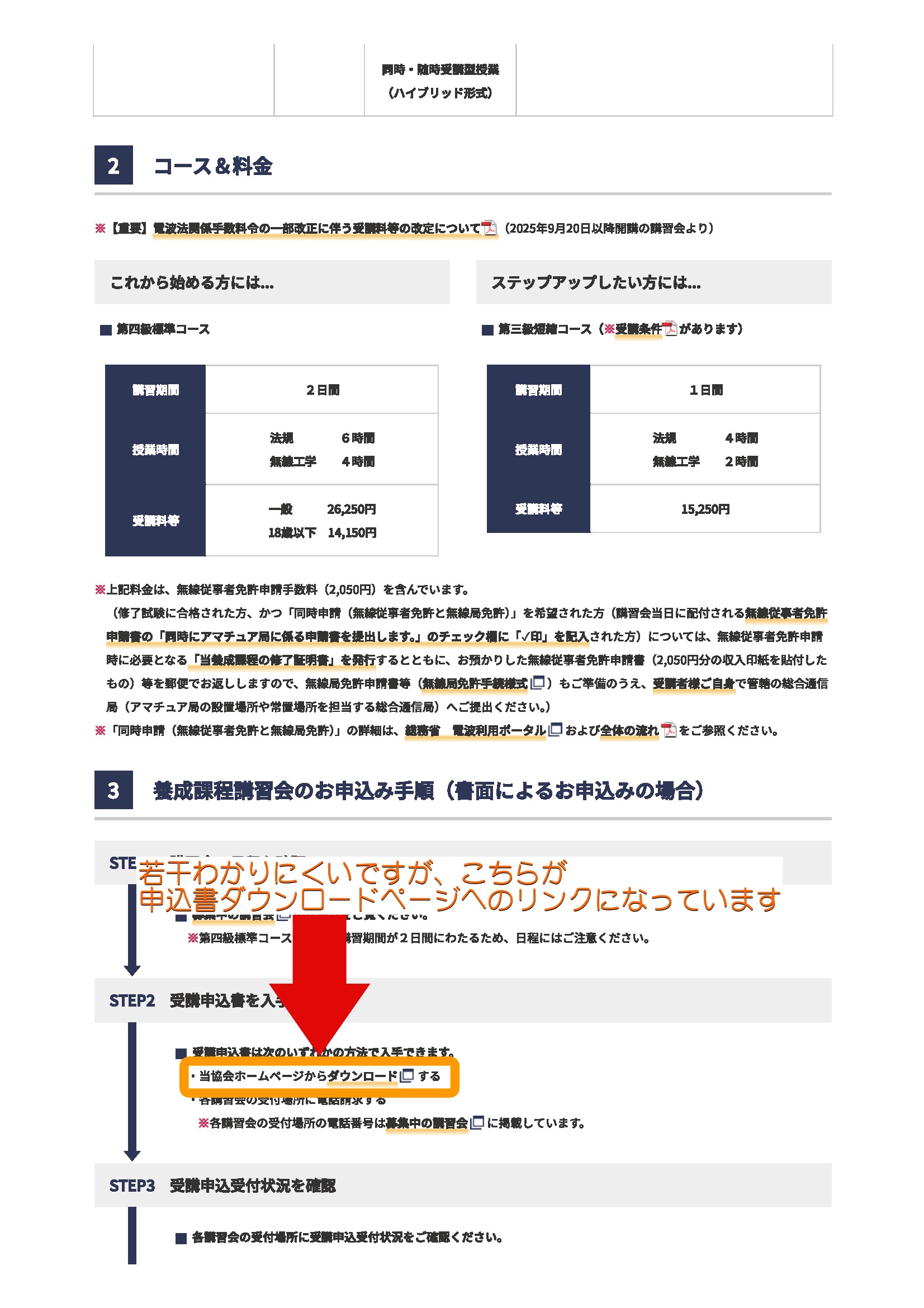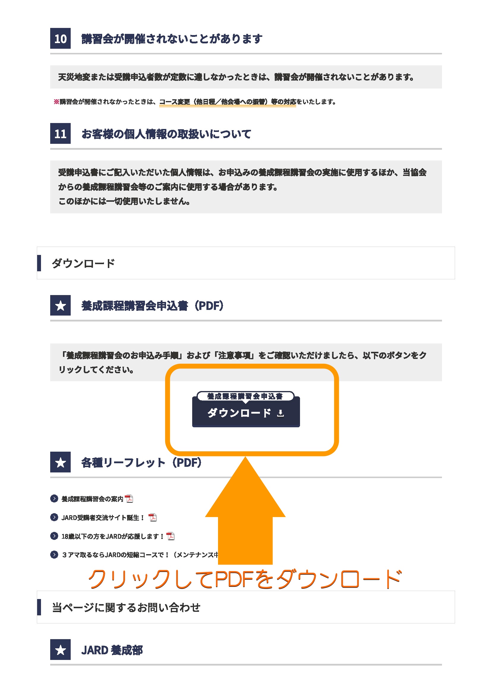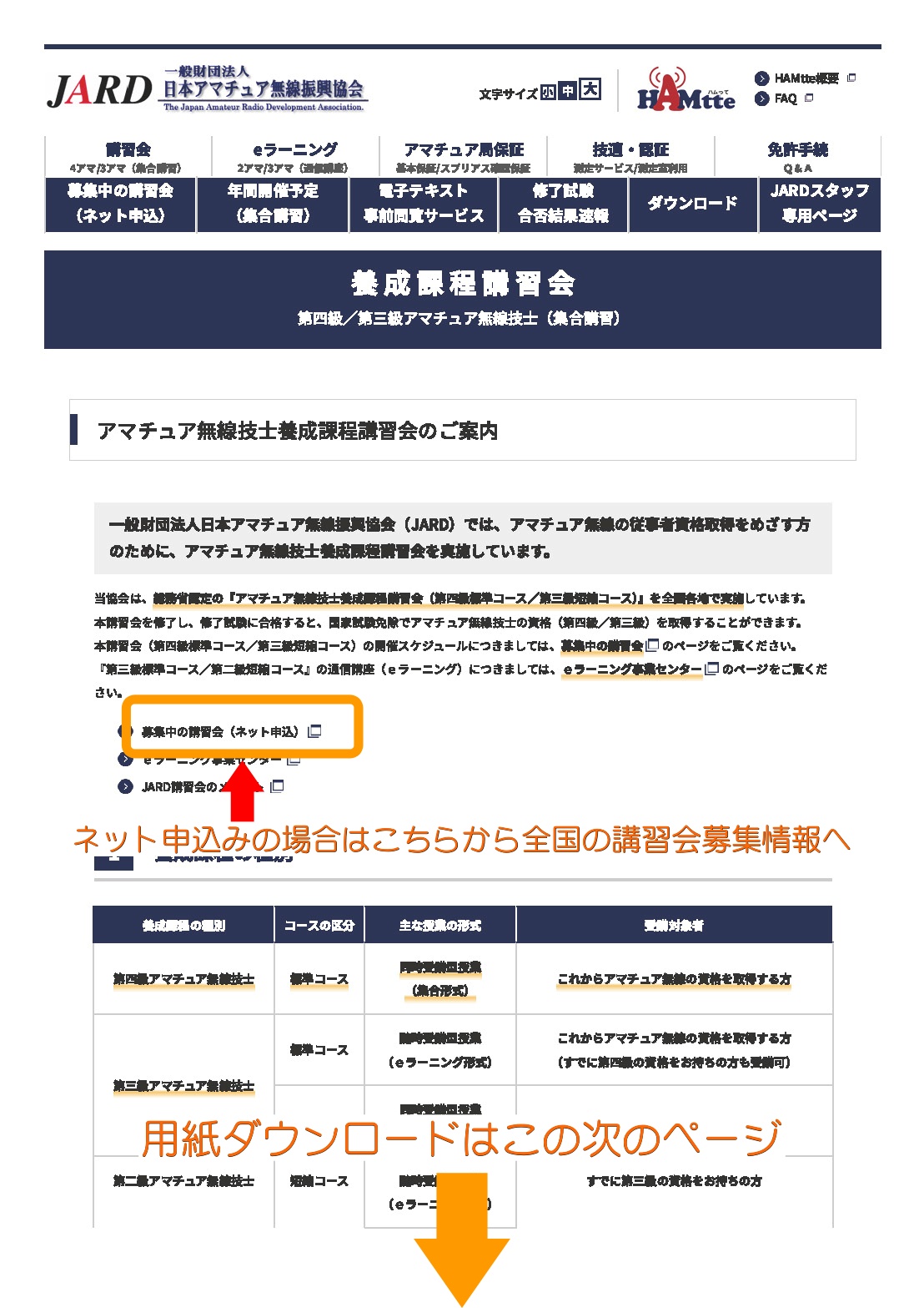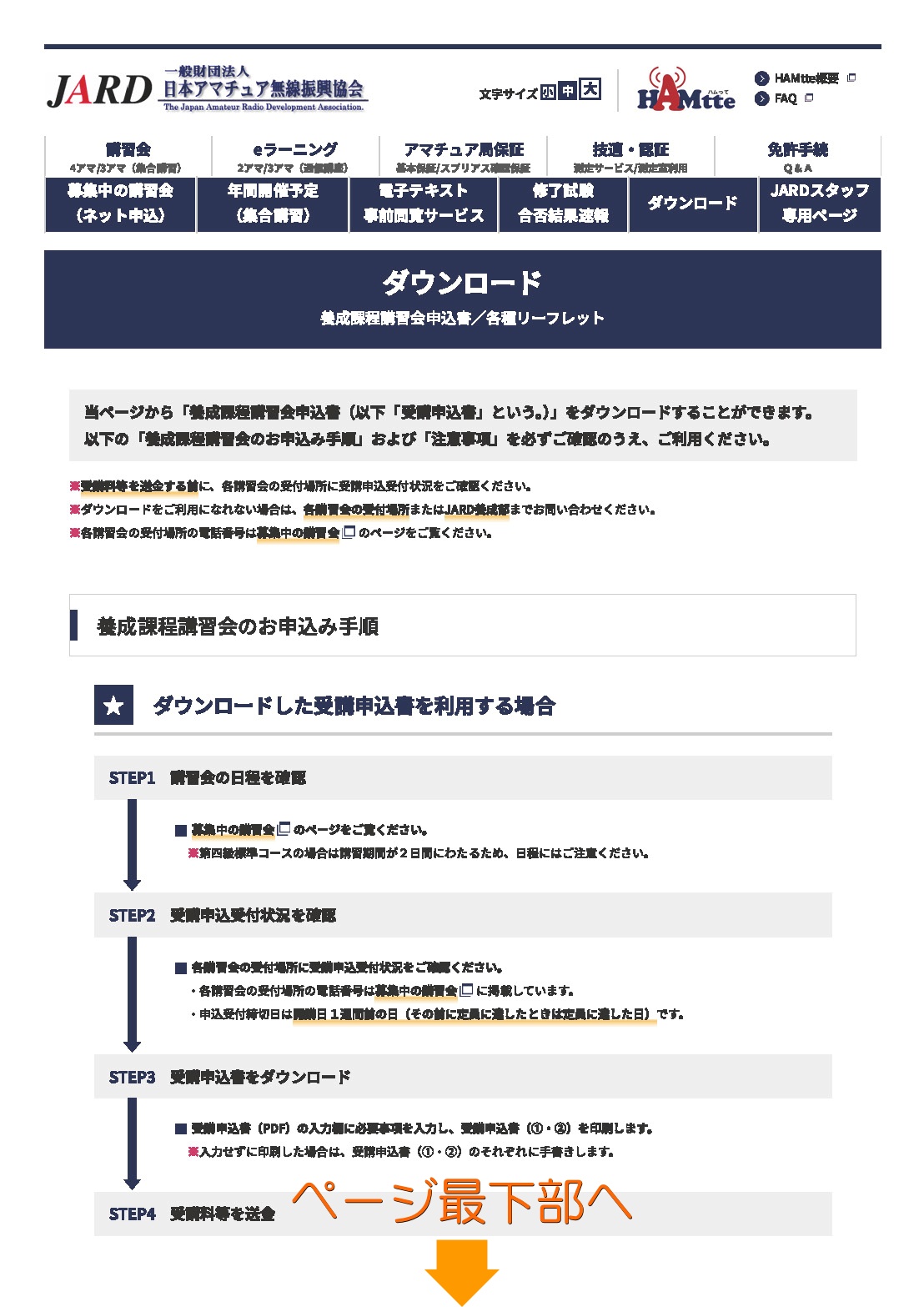 下記のように、[▶JARDの講習会ページ]から申し込むか書類をダウンロードし、プリントアウトの上、ご記入ください。